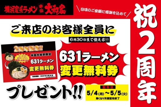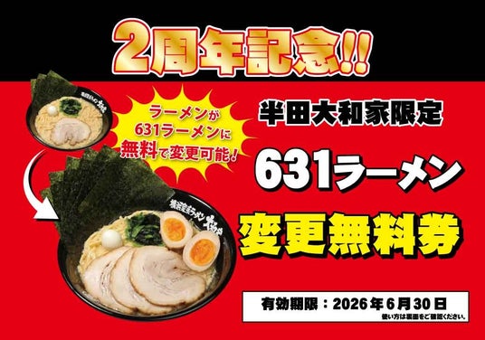株式会社AZism(本社:東京都立川市、代表取締役会長:和田 敏典)が運営する「横浜家系ラーメン半田大和家」は2周年を記念し、皆様へ感謝の気持ちを込めて、期間中ご来店いただいたすべてのお客様へ「631ラーメン変更無料券」をプレゼントいたします。