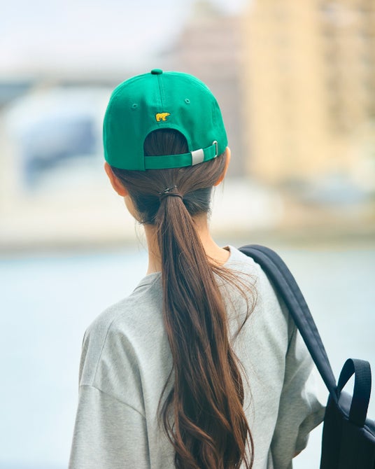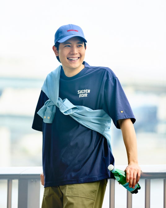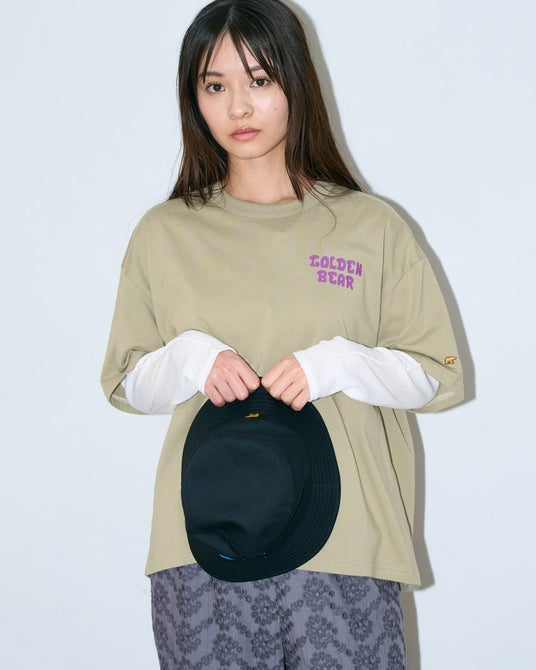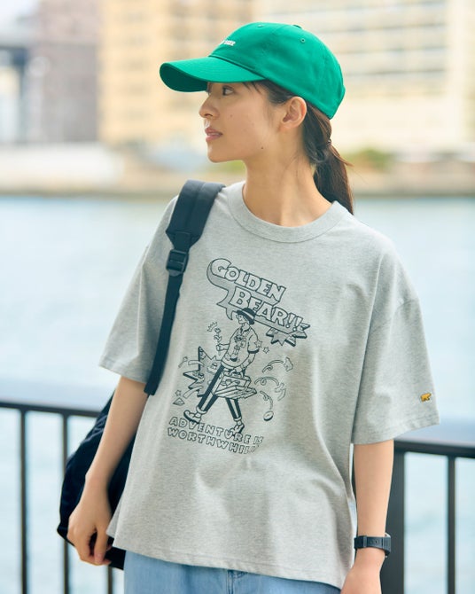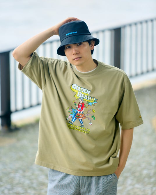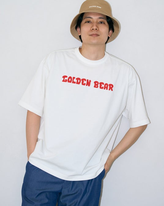べースのTシャツは透けにくく、接触冷感・吸水速乾性に優れた、なめらかな肌触りが特長のプレーティング天竺生地を使用。襟は強度のあるフライスで身頃を挟みこんだ、バインダー仕様にすることでヨレにくさにこだわりました。ゴールデンベアの通常のTシャツよりも、ややゆとりを持たせたシルエット。ラフに着られるサイズ感に仕上げました。Tシャツの左袖、ヘッドウェアの後ろに金熊の刺繍をあしらっています。