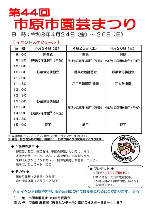 市原市内の農家が生産した苗や農産物、農産加工品の販売、地産地消推進協力店による飲食物の販売、お子さまを対象とした野菜収穫体験などを実施する「市原市園芸まつり」を開催します。