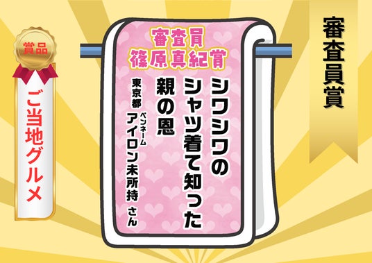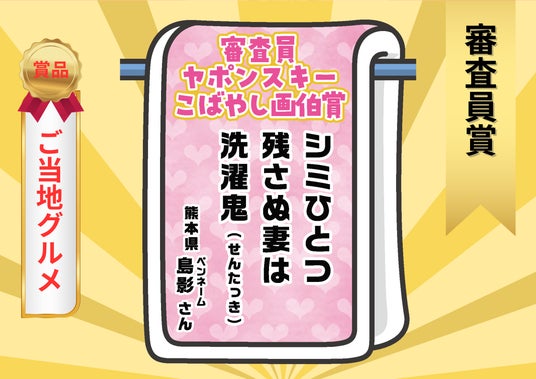 ヤポンスキーこばやし画伯夫婦の関係や、一人暮らしを始めた若者達が痛感する母の偉大さなど、洗濯を通し て見えるそれぞれの日常を、ダイジェストで見ているような楽しさがありました。 今回は3つ部門が用意され、よりたくさんの場面、角度からの川柳が多く、本当に どれが最優秀賞でもおかしくないくらい審査会は盛り上がりました。次回も面白い 川柳、期待しています!