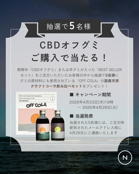 キャンペーン期間中にCBD OFF GUMMIES(クラフトコーラ味)をご購入いただいたお客様を対象に抽選で5名様に「OFF COLA」日本産ナチュラルクラフトコーラ試飲セットをプレゼントいたします。
