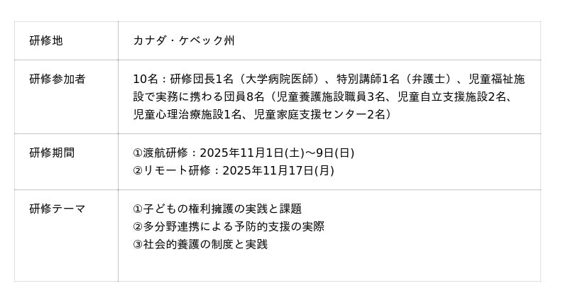 本研修は、日本の児童福祉施設で働く実務者を対象に、世界の先進的な児童福祉制度や実践を学ぶ機会を提供するものです。研修への参加者は累計750名にのぼり、日本の児童福祉領域を牽引する多くのリーダーを輩出しています。第50回目となる2025年度は、カナダ・ケベック州を20年ぶりに訪問しました。