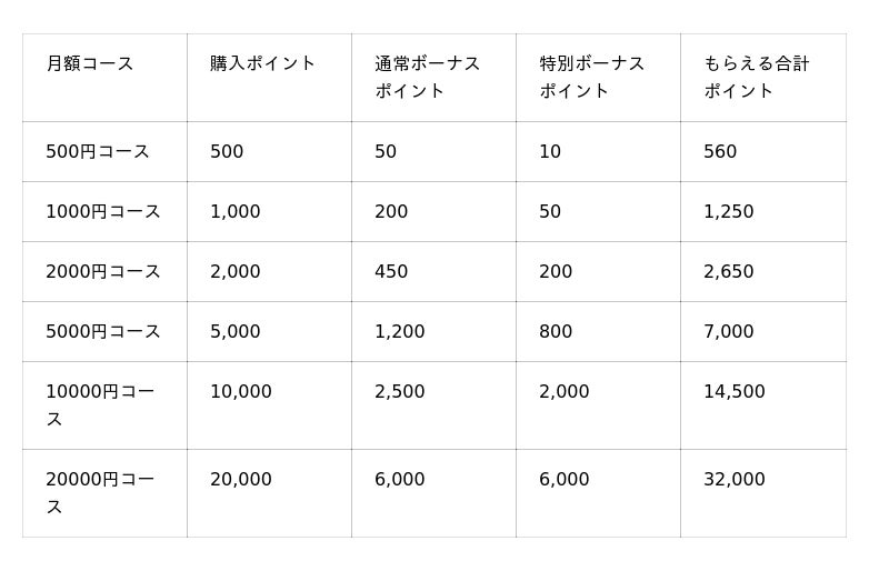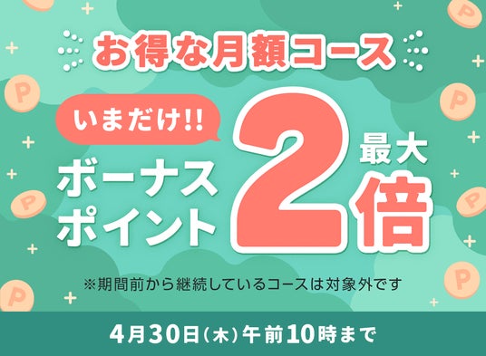 期間内に対象の月額コースにてポイントをご購入いただいた場合、最大で通常の2倍のボーナスポイントをプレゼントするキャンペーンを開催いたします。