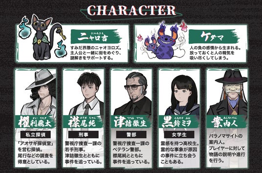錦糸町駅前で目覚めた記憶喪失の主人公。人語を解するフシギなネコ「ニャロ吉」とともに、本所七不思議が伝わるすみだの街で、怪異や謎解きに挑むことに…。さらに行く道々で『パラノマサイト』の個性豊かなキャラクターたちに出会い、自身の記憶と街の秘密に迫る、壮大な物語に巻き込まれていきます。
