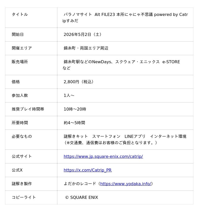 株式会社スクウェア・エニックス(本社:東京都新宿区、代表取締役社長:桐生 隆司、以下スクウェア・エニックス)は、好評発売中のホラーミステリーADV『パラノマサイト FILE23 本所七不思議』(以下パラノマサイト)とコラボレーションした、現実のすみだの街を歩いて謎を解くイマーシブミステリーウォーク『パラノマサイト Alt FILE23 本所にゃにゃ不思議 powered by Catripすみだ』(以下、本作品)を、2026年5月2日(土)より開始することをお知らせいたします。本日より公式サイトも公開いたしました。