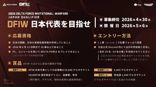 6月中旬に中国で開催される世界大会「Delta Force Invitational: Warfare 2026」への出場権をかけ、5月上旬より日本予選が実施されます。本予選では、日本代表として大会に参加する選手20名およびリザーバーの選出が行われます。予選を勝ち抜いたチームは、日本代表として世界大会へ進出し、各国の代表チームと対戦することになります。