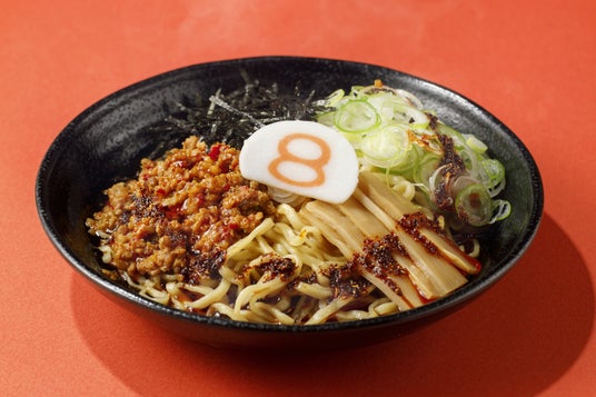 鰹や昆布、チキンの旨みが特長の8番流まぜそば「唐麺」に、肉味噌のコク深い旨味や粗挽き唐辛子の辛味が特徴の「麻辣辛肉味噌」、3種の山椒の痺れと華やかで香ばしい香りが引き立つ「麻辣オイル」をトッピングした、ガツンと刺さるような“シビ辛”がクセになるらーめんです。召し上がる前に具材をよく混ぜてお召し上がりください。