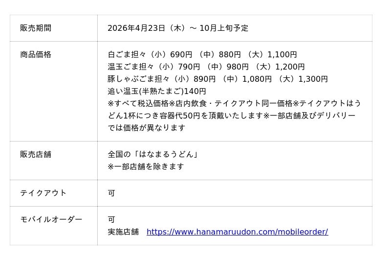 讃岐うどんチェーン「はなまるうどん」を展開する株式会社はなまる(本社:香川県高松市、代表取締役社長:前田良博)は、毎年夏に期間限定で発売し最大のヒットを記録している「冷やし担々」3種を、2026年4月23日(木)午前10時より、全国の「はなまるうどん」(※一部店舗を除く)にて、販売開始いたします。 今年は、通例であった夏の期間限定の販売ではなく、お客様からの熱いご要望にお応えし、「春夏秋」の3シーズンお楽しみいただける“新定番”のレギュラーメニューとして展開いたします。