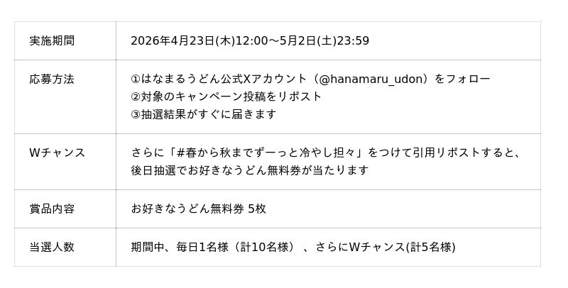 ■毎日当たる公式X冷やし担々販売記念キャンペーン発売初日より、X(旧Twitter)にて、フォロー&リポストキャンペーンを実施します。その場で当たりがわかるインスタンウィン形式で、期間中は毎日参加可能です。