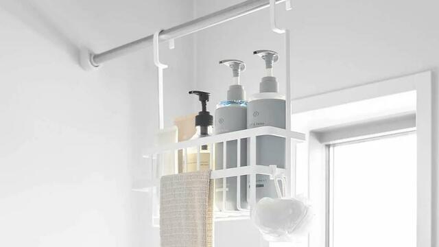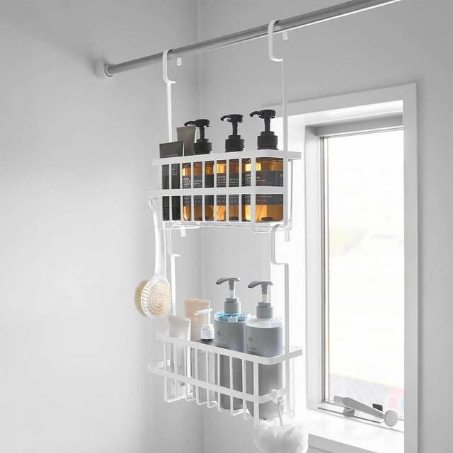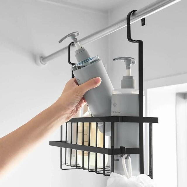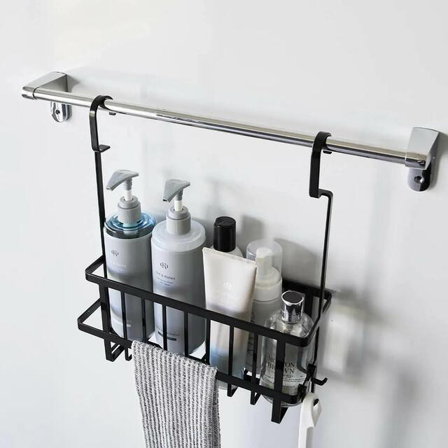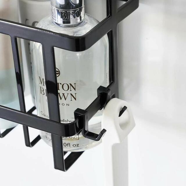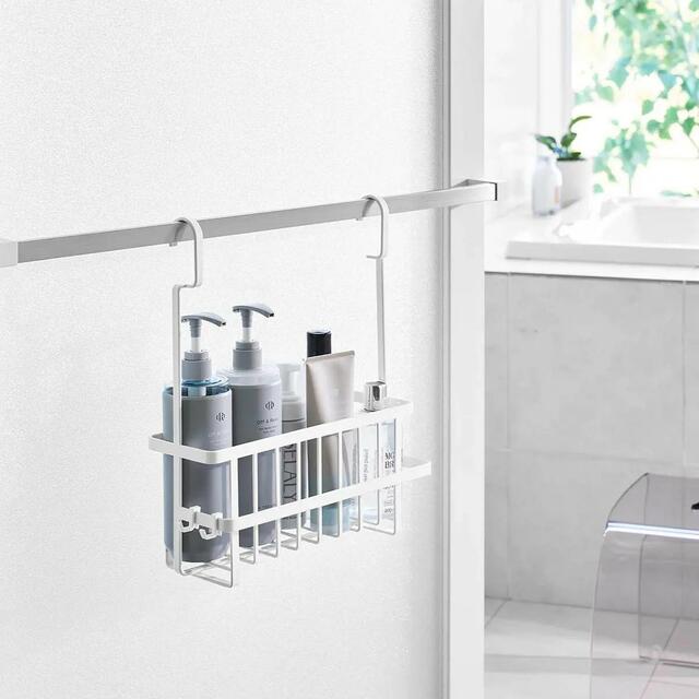ランドリーパイプやタオルバー、浴室扉のハンドルに引っ掛けてバス用品を収納できるバスケットです。