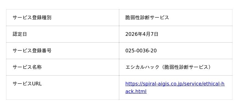 スパイラル アイギス株式会社(東京都港区、代表取締役 島谷 豊)は、当社サービス「エシカルハック(脆弱性診断サービス)」が、経済産業省が策定した「情報セキュリティサービス基準」に適合していると認定され、「情報セキュリティサービス台帳」および「情報セキュリティサービス基準適合サービスリスト」に登録されましたので、お知らせいたします。