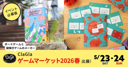 ClaGlaが幕張メッセで行われる「ゲームマーケット2026春」に出展します。新作のボードゲームや謎解きゲームをイベント価格で販売いたします。