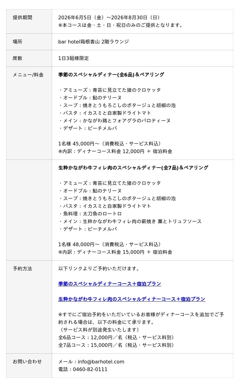 シマダハウス株式会社(東京都渋谷区、代表:島田一成)が運営する「bar hotel箱根香山」(神奈川県箱根町小涌谷)では、2026年6月5日(金)より、箱根の自然と季節感をテーマにした夏季限定ディナーコースの提供を1日3組様限定で開始いたします。