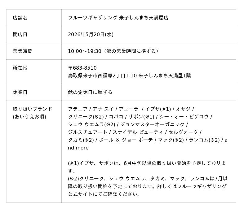 エフ・ジー・ジェイ株式会社(本社:東京都港区、代表取締役社長:吉田 和弘)が運営するビューティセレクトショップ「フルーツギャザリング」は、2026年5月20日(水)に、鳥取県米子市の百貨店「米子しんまち天満屋」に新店をオープンします。2013年2月に「エキュート品川店」をオープン以来、全国に店舗を拡大してきたフルーツギャザリングは、今回のオープンで全国30店舗目となります。