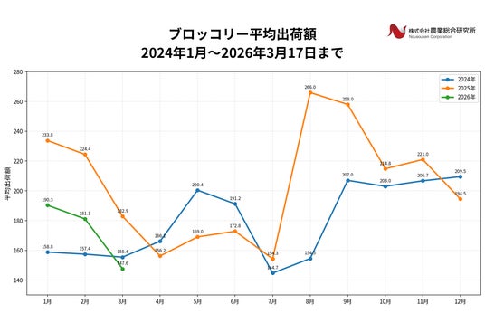 「農家の直売所」におけるブロッコリーの平均出荷価格は、2024年・2025年・2026年を通じておおむね150~230円の範囲で推移しています。