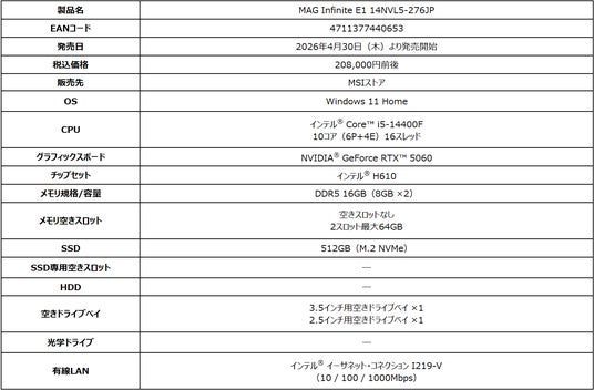 https://jp.msi.com/Desktop/MAG-Infinite-E1-14NVL5-276JP