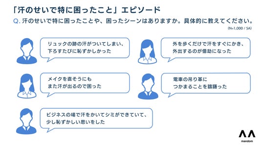 中には「リュックの跡の汗がついてしまい、下ろすたびに恥ずかしかった」や「外を歩くだけで汗をすぐにかき、外出するのが億劫になった」など、汗が原因で日常生活に支障を感じているという声が多く寄せられました。