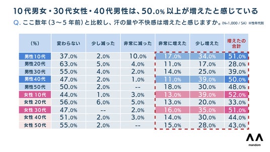 株式会社マンダムは、生活者の汗に関連するお悩みの解消をサポートするため、10~50代の男女1,000名を対象に「汗とにおいに関する意識調査」を実施しました。