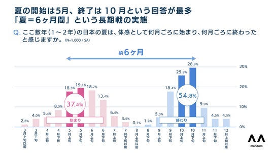 ■体感上の夏は「半年間」に1. 夏の始まりは「5月」、終了は「10月」の回答が最多。もはや1年の半分が夏へ。