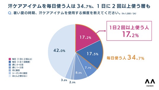 汗ケアアイテムの使用頻度について聞いたところ、34.7%が「毎日」使っていると回答し、中でも17.2%は「1日に2回以上」と複数回使用していることがわかりました。こまめな汗ケアが現代人にとって必要不可欠な生活のルーティンになりつつある実態が浮き彫りになりました。
