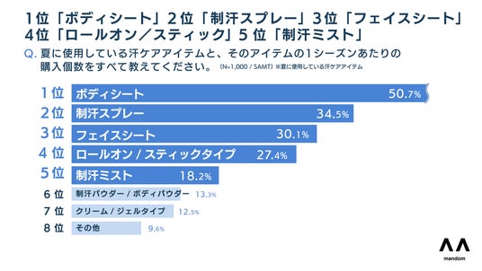夏に使用している汗ケアアイテムを聞いたところ、1位「ボディシート(50.7%)」、2位「制汗スプレー(34.5%)」、3位「フェイスシート(30.1%)」、4位「ロールオン/スティック(27.4%)」、5位「制汗ミスト(18.2%)」という結果に。