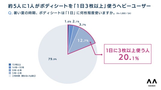夏場の1日あたりのボディシート使用状況について聞いたところ、約5人に1人(20.1%)が「1日に3枚以上」ボディシートを使用しており、ヘビーユーザーの存在が明らかになりました。