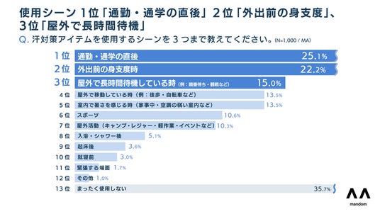 5. 汗ケアアイテム利用シーンは、「通勤・通学後」や「身支度時の予防」などの日常づかいが上位に。