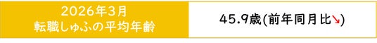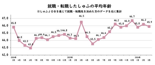 転職しゅふの平均年齢は45.9歳となり、前月比-0.3歳、前年同月比では-0.6歳となりました。