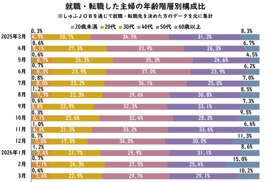 3月は例年、学校の長期休暇や新学期前の準備により、子育て層の求職活動が鈍化しやすい時期ですが、今年は40代の比率が上昇しており、子育て層の一部に動きが見られます。