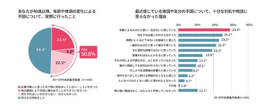 40~50代の女性において、自身の不調に気づいていても、そのうち約半数(50.6%)が「特に対処していない」または「何をすればいいかわからない」と行動を起こせていない実態が判明しました。