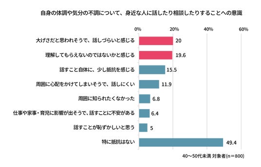 - 不調を周囲に相談することに対し、大げさだと思われそうで話しづらい」(20.0%)や「理解してもらえないのではないか」(19.6%)という周囲の目を不安視
