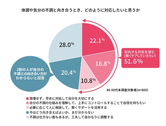 - 51.6%の女性は「体調や気分の不調に前向きに対処したい」と回答