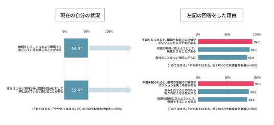 - 「本当はつらい気持ちを、周囲や自分に対して押し込めていると感じることがある」と回答した人のうち、95.1%が「不調を知られると、職場や家庭での評価やポジションを失う不安がある」と回答