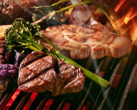 グリル:鶏もも肉のグリル、豚肩ロース炭火焼き(平日限定)、牛肉の炭火焼き(土日祝限定)