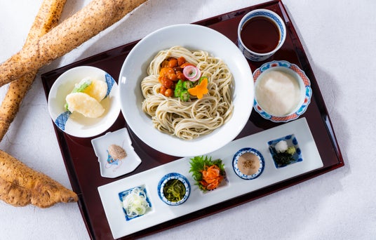 日本各地からの厳選した旬の食材を取り揃える<和食庵>では、布海苔を練り込んだコシの強い麺が特徴の布海苔蕎麦と自然薯を合わせた「唐津自然薯とろろ蕎麦」が登場。佐賀県唐津市のささき農園から届くこだわりの自然薯をとろろと天麩羅でご用意いたします。とろろ蕎麦でお召し上がりいただいた後は、お好みでめかぶやおくら、なめこと合わせて食感の変化をお楽しみいただくのもおすすめです。有田焼の器とともに涼やかな一皿をご堪能ください。