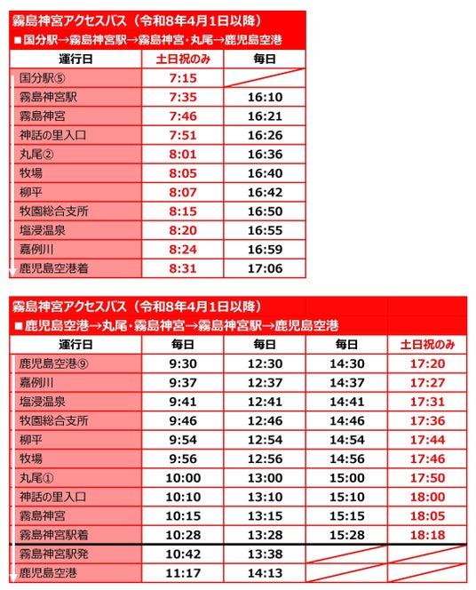 特に、2026年3月まで、15時台以降に鹿児島空港から霧島神宮・霧島神宮駅へ乗り換えなしで向かえる公共交通機関(タクシー除く)が存在しなかったことから、夕方の移動需要に対応するため増便を行いました。