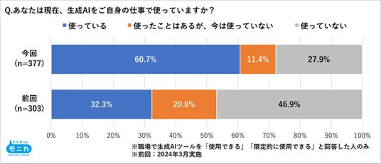 ・職場での生成AI使用率は60.7%で約6割と約2年前(32.3%)からほぼ倍増。
