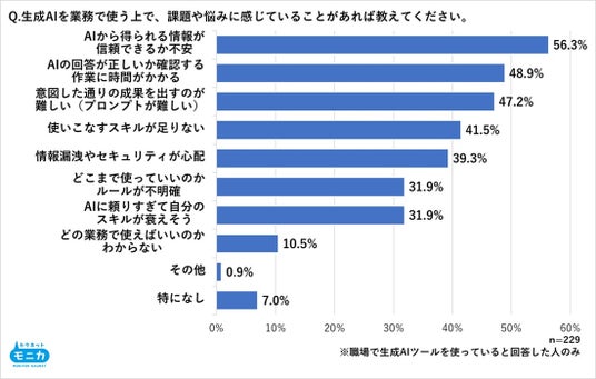 ・業務における生成AI活用の課題は「情報の信頼性(56.3%)」が最多。さらに約半数(48.9%)が「回答の正誤確認に時間がかかる」と回答し、効率化の裏で新たな工数が発生している実態が浮 き彫りに。