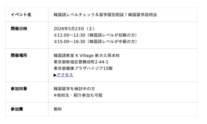 日本最大級の韓国語教室「K Village 韓国語」を運営する株式会社K Village(本社:東京都新宿区、代表取締役社長:桑原 元就)は、韓国語学習者の韓国留学への一歩を後押しすることを目的に、韓国人スタッフによるレベルチェックと留学カウンセラーによる説明会を実施します。