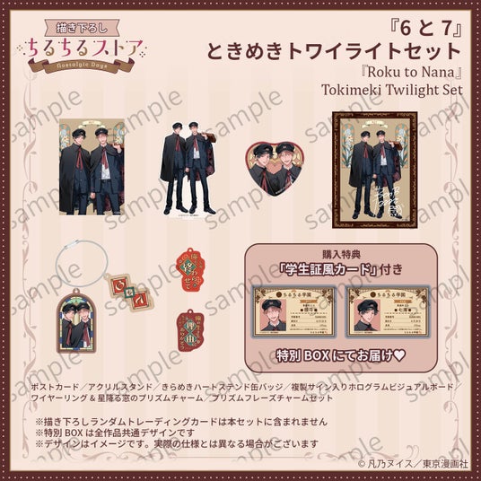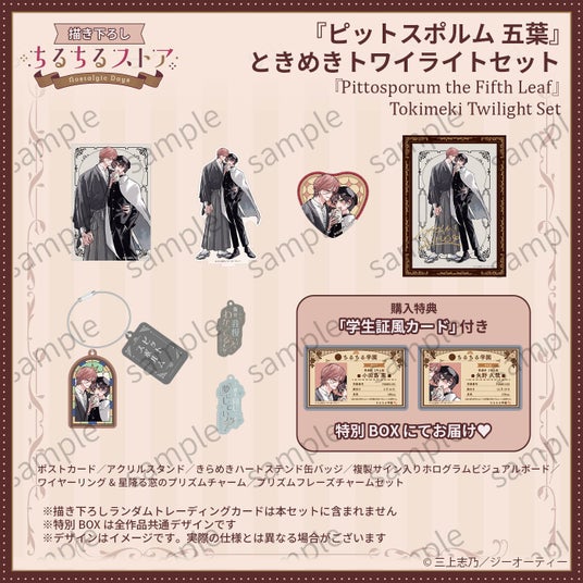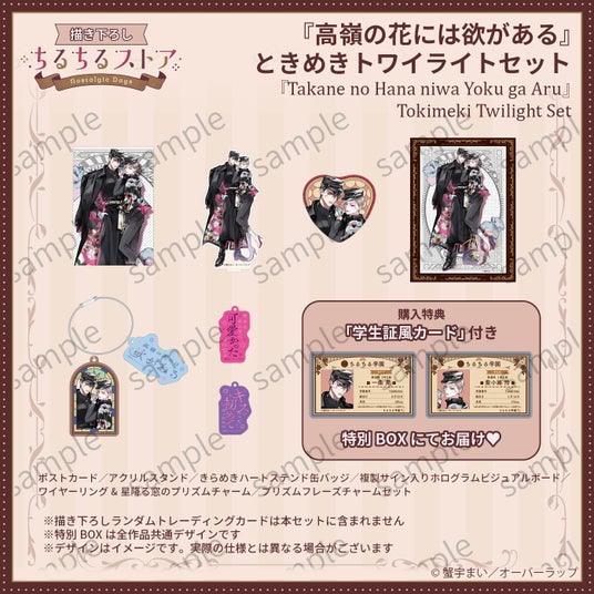 各作品のアイテム6点がセットになったまとめ買いが便利なセットです。本セットをご購入の方限定特典として学生証/会員証風カードがついてきます!さらに、ときめきトワイライトセット専用の特別BOXにてお届け(ハート)