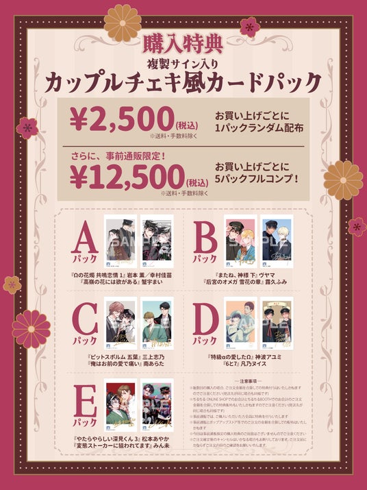 今回の通販では、特典として、2,500円お買い上げごとに複製サイン入りのカップルチェキ風カードパック(1パック2枚入り、全ランダム)をおつけいたします。人気BL作家が一同に揃う特典は極めてレア!このチャンスをお見逃しなく!