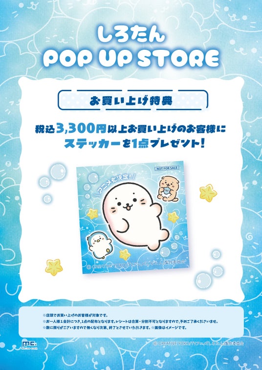 初のテレビアニメ化が決定した『しろたん』は、1999年に誕生したたてごとアザラシのキャラクターです。今回のポップアップショップでは、マスコットをはじめとするさまざまなグッズが勢ぞろい。税込3,300円以上お買い上げいただいた方に特典として「ステッカー」を1点プレゼントいたします。