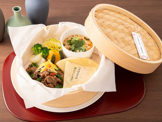 生姜やオイスターソースの牛肉がメインのせいろ蒸し。冬の園遊会で生姜や柑橘の皮を使い、体を温めたエピソードを表現。主食は3種類からお選びいただけます。