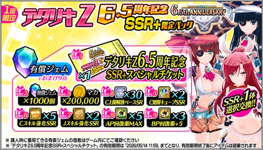 交換ラインナップからお好きなSSR+コスプレを選んで交換できる「デタリキZ6.5周年記念SSR+スペシャルチケット」などの豪華なおまけ付きのお得なパックを販売いたします。