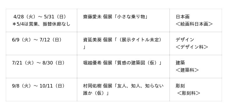 岩絵具で乗り物を描く齋藤愛未の個展『小さな乗り物』を皮切りに、会話や音といった不可視の現象を扱い、線や形態として空間に表現する資延美葵、「経験としての建築」がどのようにたち現れるかをドローイングを通して示す堀越優希、そして複雑なバランスで成り立っている人間を、さまざまな素材を用いた彫刻として制作する村岡佑樹の個展を順次開催いたします。