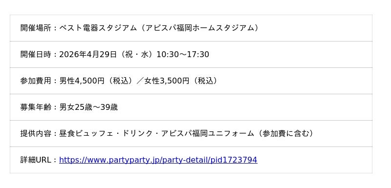 国内最多*の成婚数を誇る株式会社IBJ(代表取締役社長:土谷 健次郎、本社:東京都新宿区、東証プライム:6071、以下「IBJ」)が運営する婚活パーティーサービス「IBJ Matching」は、明治安田生命福岡支社と協業し、2026年4月29日(水・祝)に福岡市の「ベスト電器スタジアム」にて、Jリーグ「アビスパ福岡」とコラボレーションした婚活イベントを開催します。単身世帯率が5割を超え、交流の固定化が課題となる福岡市において、地元クラブの試合観戦を通じた「共通体験」を提供。スタジアム特有の高揚感を活かし、自然なコミュニケーションが生まれる特別な出会いの場を創出します。