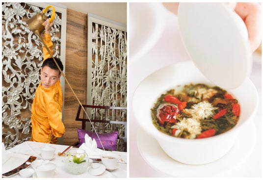 国家資格を持ったティーマスターと呼ばれる茶藝師の芸術的パフォーマンスでお楽しみいただく八宝茶。ジャスミン、紅なつめ、クコ、菊花、氷砂糖、百合根、龍眼、クルミでご用意する四川豆花飯荘の八宝茶は、次の一皿に備え後味を整えるため、茶藝師が何杯でもお注ぎします。時間とともに氷砂糖が溶け出すなど、飲むたびに変化する八宝茶と四川料理との抜群のマリアージュをお楽しみください。