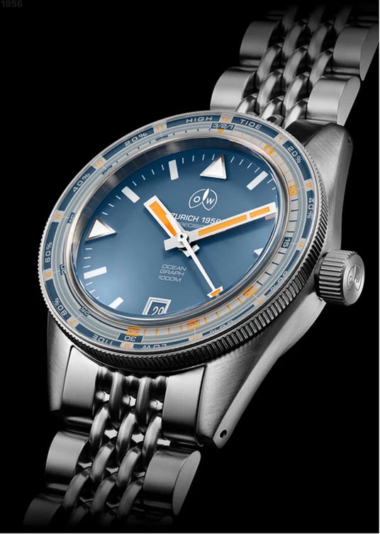 オーシャン・ブルーとハイビズ・オレンジに彩られた文字盤は、濁水や低照明での識別性も高い対比色。その実践性に裏付けられたアイコニックな印象は1970年ダイバーズ文化へのオマージュにも繋がるオレッヒ&ワイスの最新にして最高のシグネーチャー・モデルと言えるでしょう。