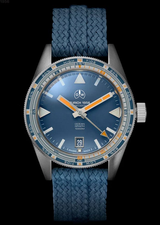 潮位/潮汐サイクル/60分の計測を可能にした3層構造ベゼル、ブルーとオレンジの対比色を強化し低照度での視認性を確保する文字盤、39.5mmのコンパクト径ケースや軽量で乾燥性の高いストラップ(グローブ着用に対応)など、数々の緻密な調整を加え、一流ダイバーの競技対応へのこだわりとオレッヒ&ワイスの機能至上主義を結集したシグネーチャーモデルです。