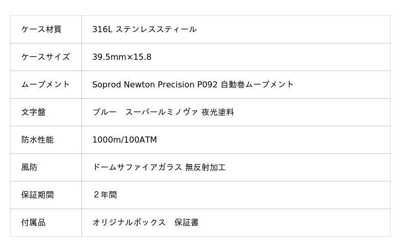 1000m/100ATMの防水性能に加え、ブルー文字盤に映えるオレンジの針、3層構造のベゼル、ケースサイズ39.5mmというコンパクトな設計。